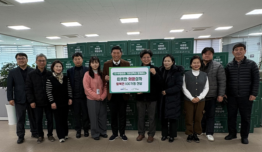 (주)우앤이는 희망친구 기아대책과 협력하여 탈북민 100가구에 '희망상자'를 전달, 겨울철 취약계층 지원을 실시했습니다. 이는 ESG 경영의 '사회적 가치(Social)' 실현을 위한 사회공헌 활동으로, 정착 초기 탈북 가정의 생활 부담 경감 및 정서적 지지 강화에 중점을 두었습니다.